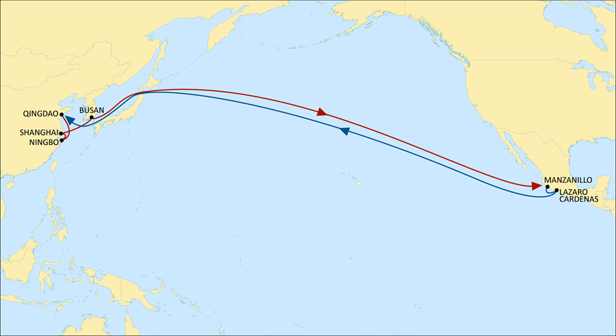 The full rotation is: Qingdao - Ningbo - Shanghai - Busan - Manzanillo - Lazaro Cardenas - Qingdao.