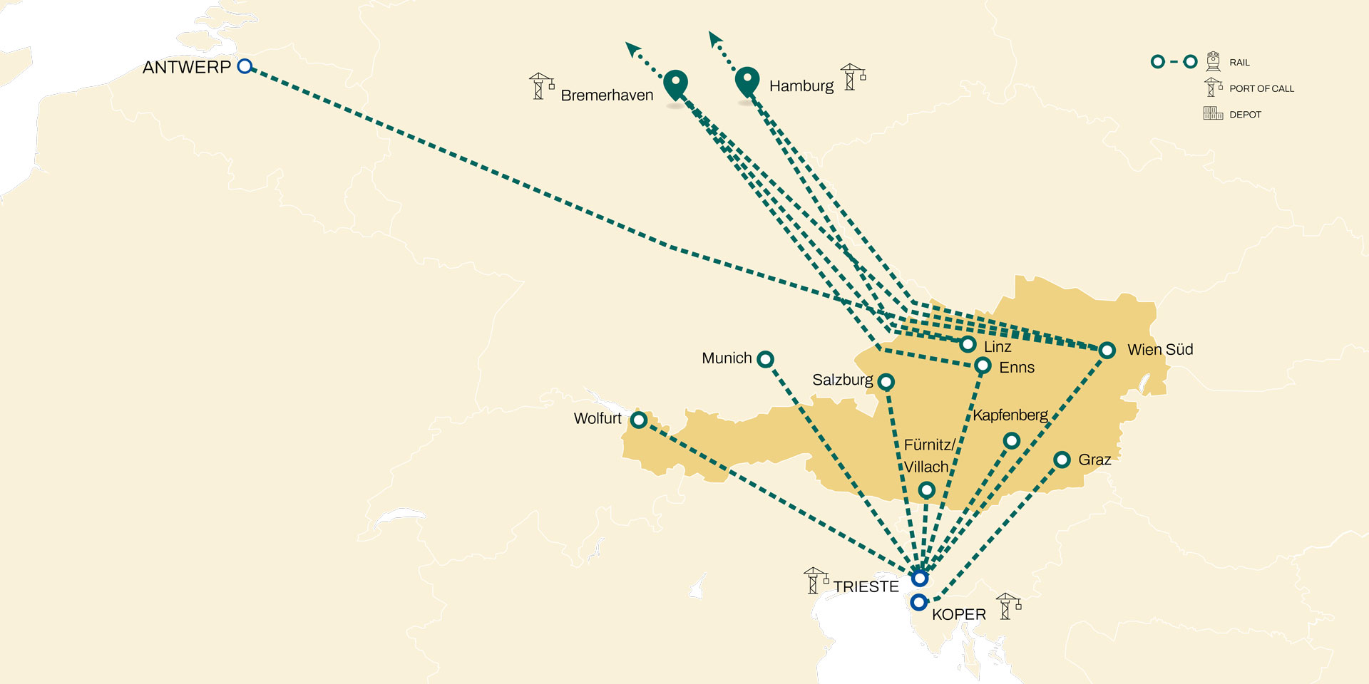 Die Häfen von Triest und Koper sind das günstigste Tor nach Mitteleuropa, und MSC betreibt dort regelmäßig Schienen- und Schiffsverkehr. Mit unseren einzigartigen Bahnverbindungen von und nach Österreich bedienen wir auch die mitteleuropäischen Länder Slowakei, Ungarn, Tschechien und Süddeutschland.
