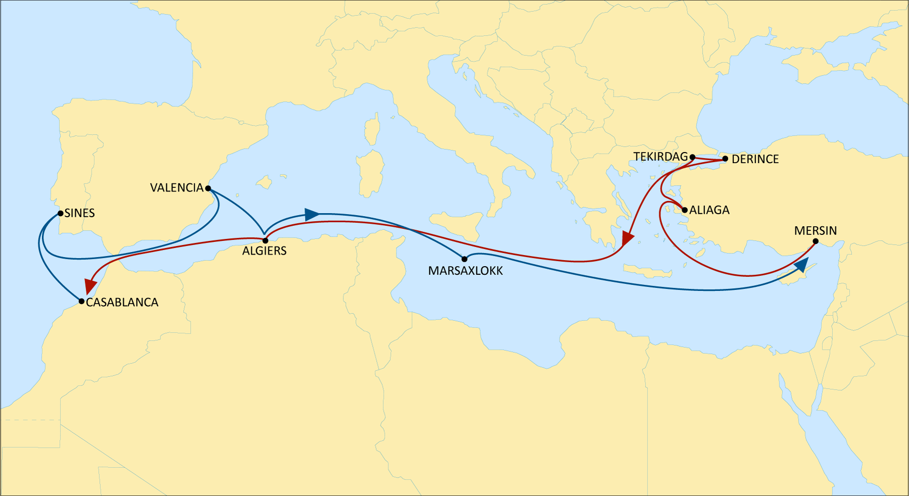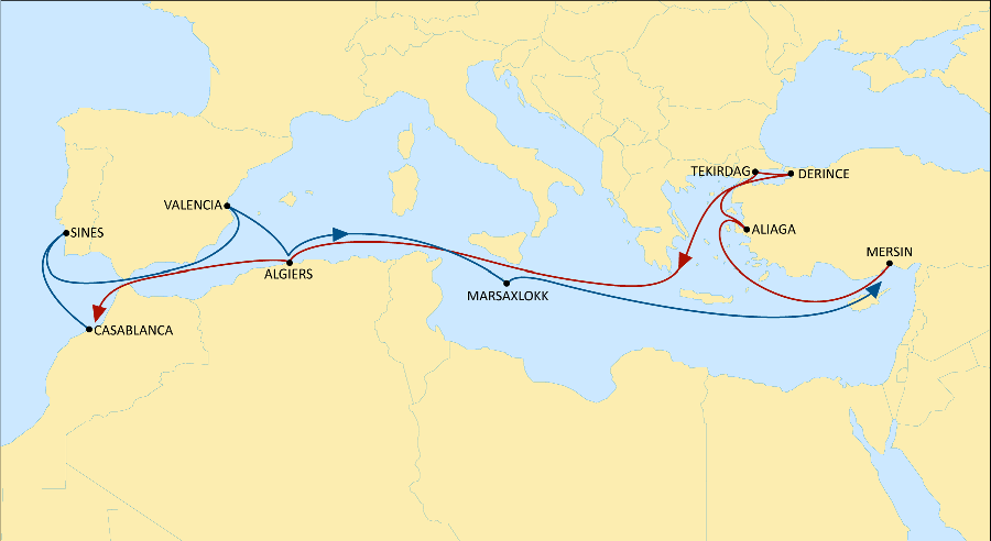 The line will rotate as follows: Mersin – Aliaga – Derince – Tekirdag – Algiers – Casablanca – Sines – Valencia – Algiers – Marsaxlokk – Mersin