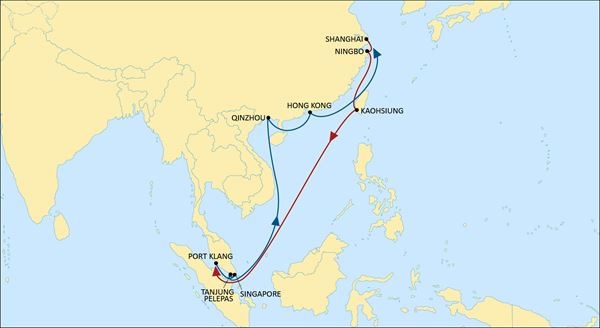 Shanghai – Ningbo – Kaohsiung – Port Klang – Singapore – Tanjung Pelepas – Qinzhou – Hong Kong – Shanghai