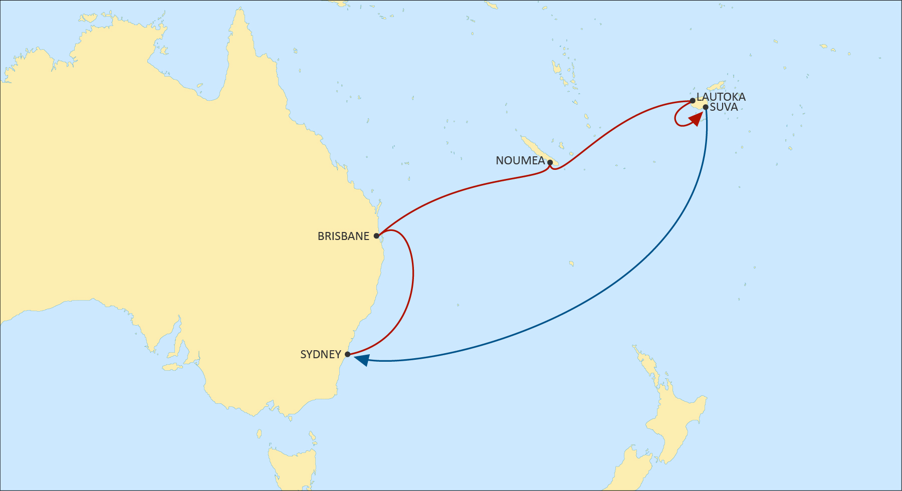 Sydney* – Brisbane* – Noumea* – Lautoka** – Suva** – Sydney*
