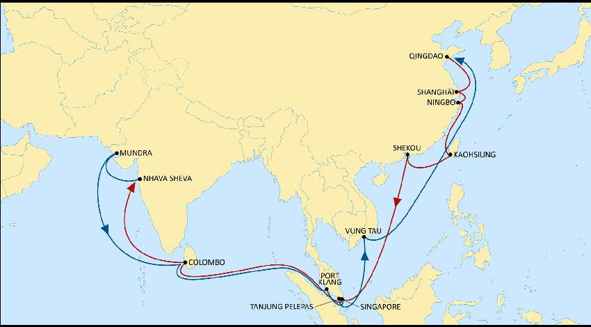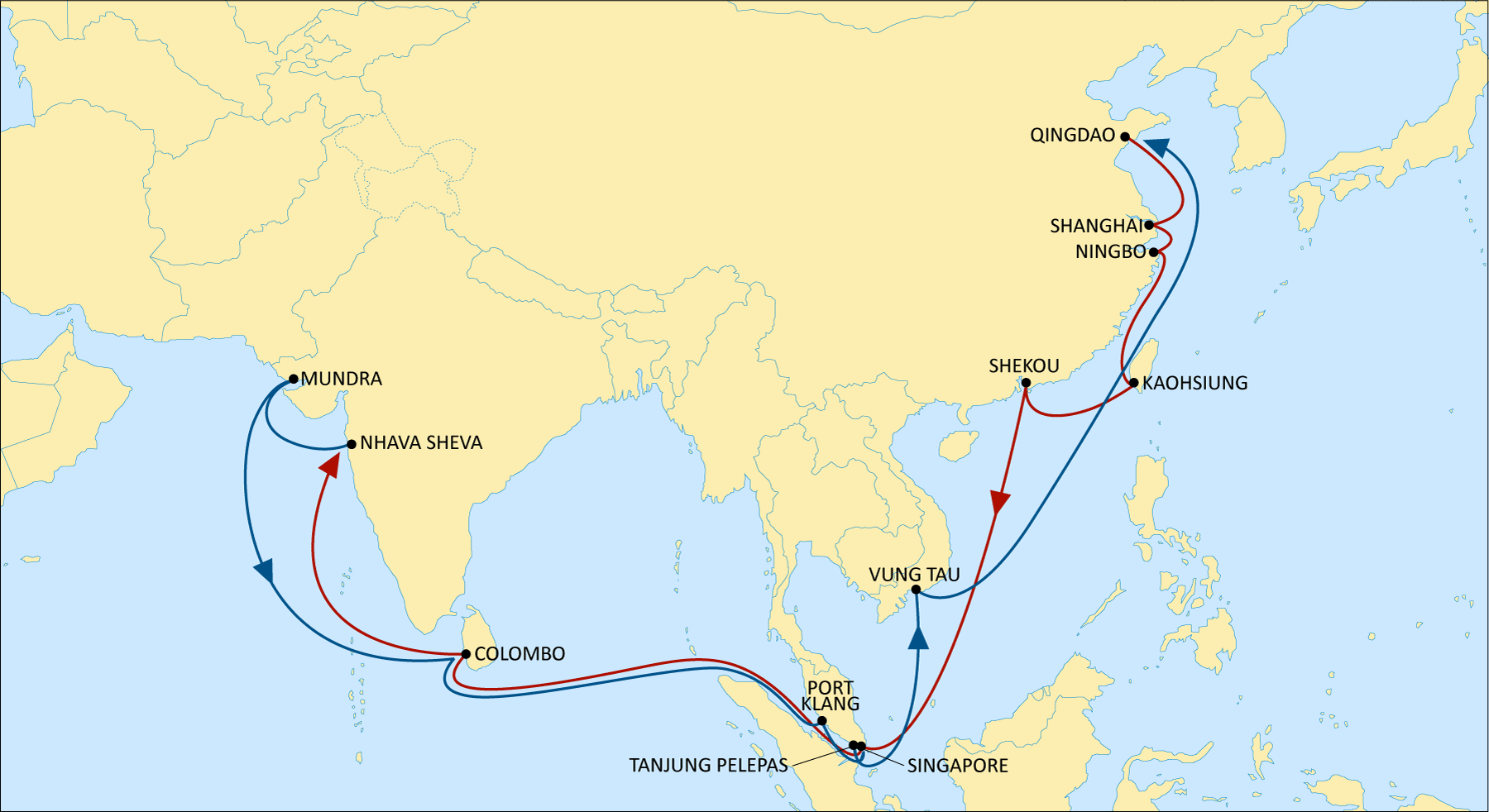 Qingdao – Shanghai – Ningbo – Kaohsiung – Shekou – Singapore – Colombo – Nhava Sheva – Mundra – Colombo – Port Klang – Singapore – Tanjung Pelepas – Vung Tau – Qingdao