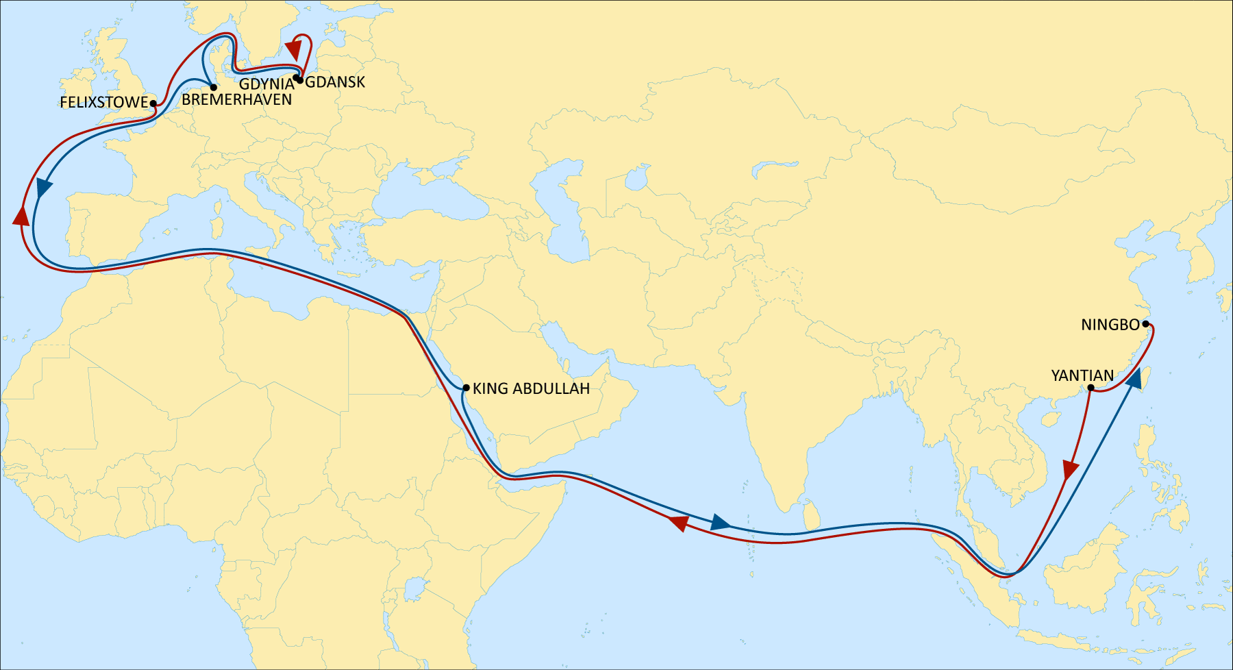 Ningbo – Yantian – Suez – Felixstowe – Gdansk – Gdynia – Bremerhaven – Suez – King Abdullah – Ningbo