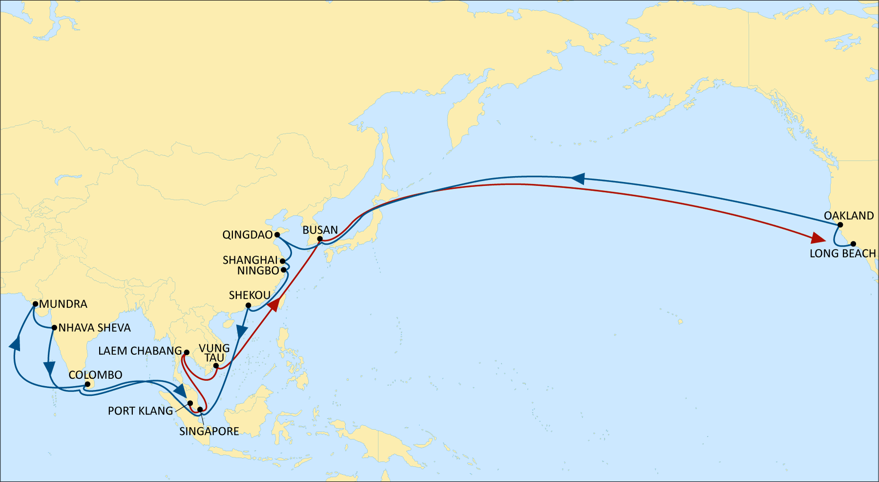 Transit times will be Busan to Long Beach in 12 Days, Mundra to Long Beach in 40 days.