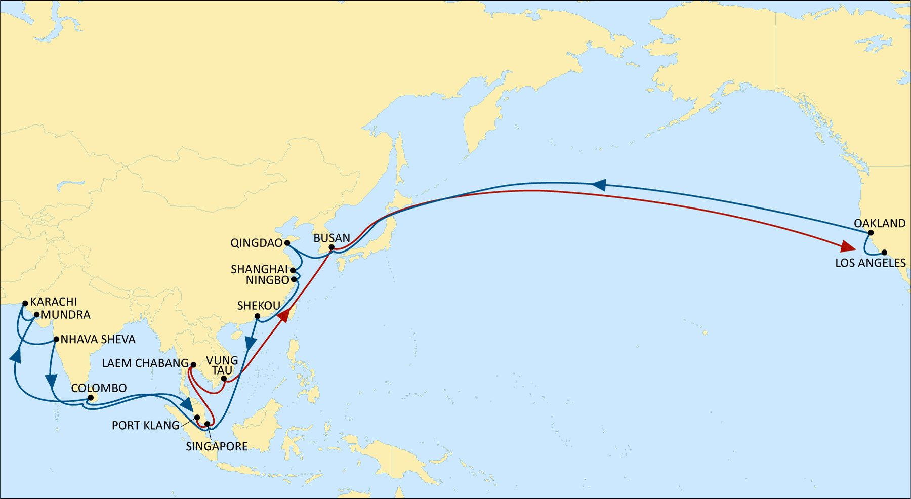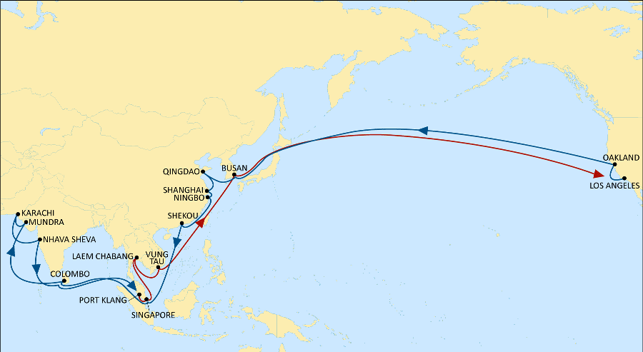 The full rotation is: Port Klang – Singapore – Laem Chabang – Vung Tau – Busan – Los Angeles – Oakland – Busan – Qingdao – Shanghai – Ningbo – Shekou – Singapore – Colombo – Mundra – Karachi – Nhava Sheva – Colombo – Port Klang.