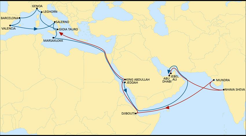 Abu Dhabi – Jebel Ali – Nhava Sheva – Mundra – Djibouti – King Abdullah Port – Gioia Tauro – Leghorn – Genoa – Barcelona – Valencia – Salerno – Gioia Tauro – Marsaxlokk – King Abdullah Port – Jeddah – Abu Dhabi