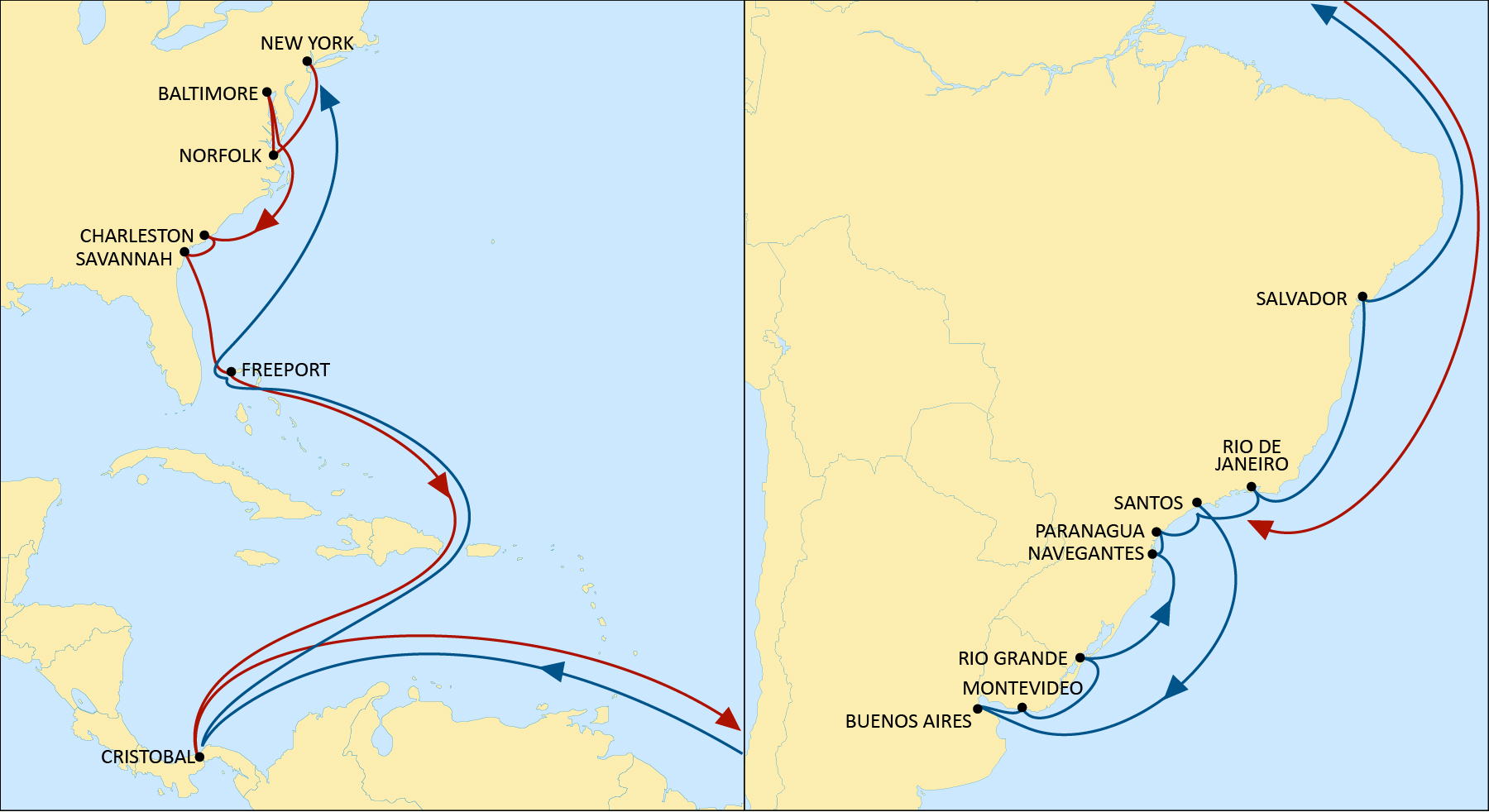 New York – Norfolk- Baltimore – Charleston – Savannah – Freeport – Cristobal – Santos – Buenos Aires – Montevideo – Rio Grande – Navegantes – Paranagua – Santos – Rio de Janeiro – Salvador – Cristobal – Freeport – New York