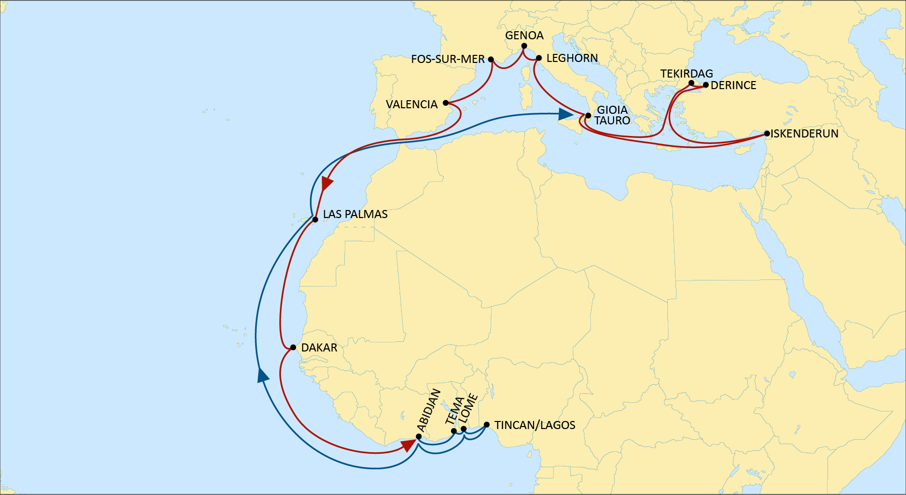 Tekirdag – Derince – Iskenderun – Gioia Tauro – Leghorn – Genoa – Fos-sur-Mer – Valencia – Las Palmas – Dakar – Abidjan – Tema – Lomé – Tincan/Lagos – Lomé – Abidjan – Las Palmas – Gioia Tauro - Tekirdag