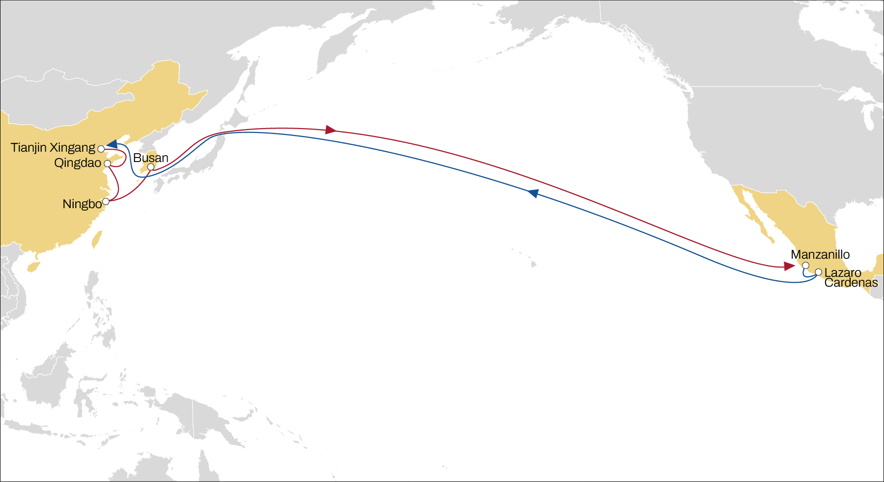 Tianjin Xingang – Qingdao – Ningbo – Busan – Manzanillo – Lazaro Cardenas