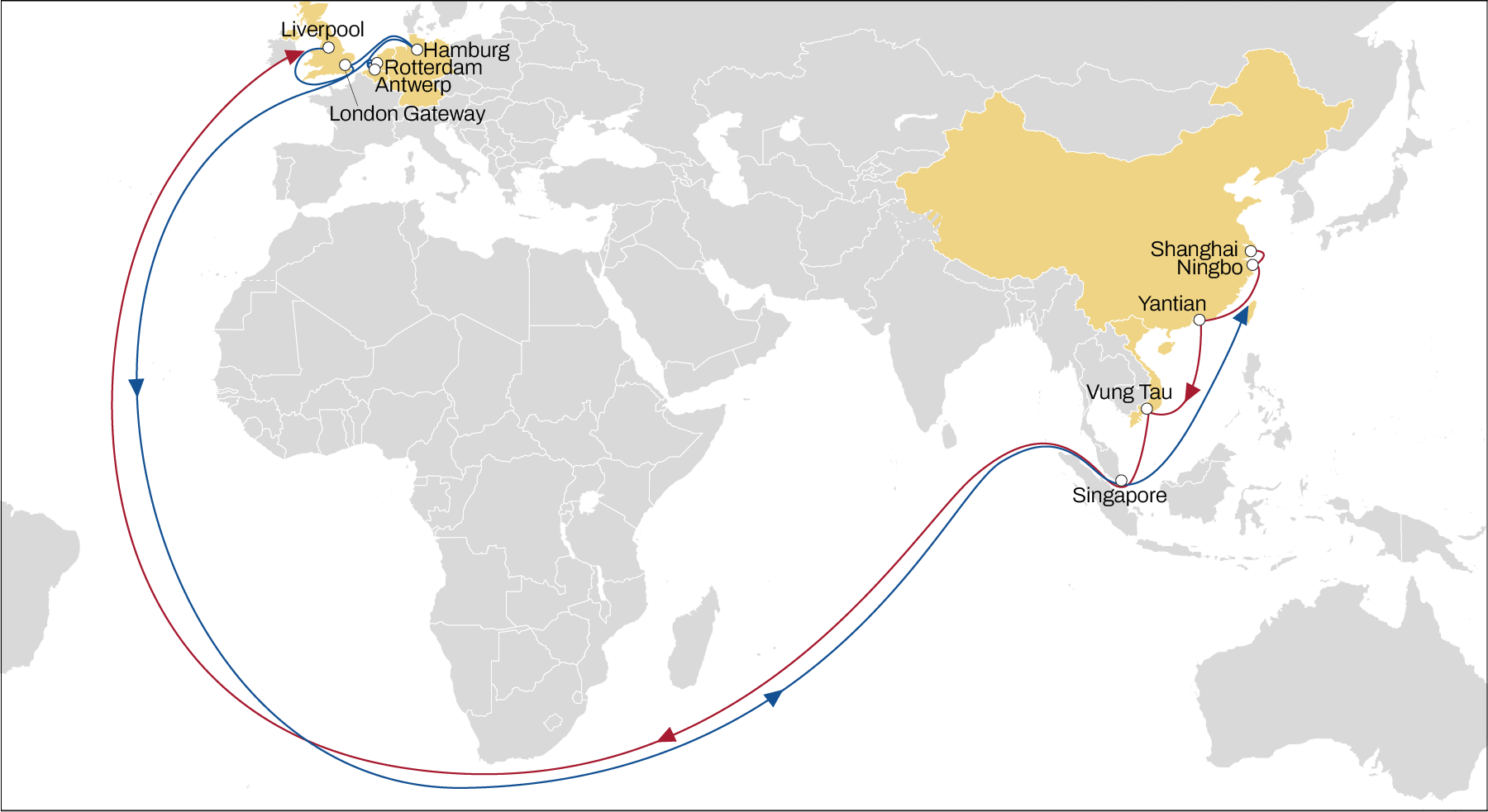 Shanghai – Ningbo – Yantian – Vung Tau – Liverpool – Rotterdam – Antwerp – Hamburg – London gateway – Singapore – Shanghai