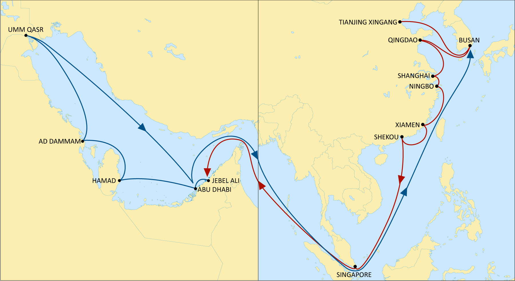 Xingang – Busan – Qingdao – Shanghai – Ningbo – Xiamen – Shekou – Singapore – Jebel Ali – Abu Dhabi – Hamad – Ad Dammam – Umm Qasr – Abu Dhabi – Xingang.